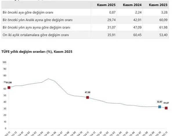 Türkiye İstatistik Kurumu (TÜİK), kasım ayı enflasyon verilerini açıkladı. Buna göre, TÜFE’deki değişim 2025 yılı Kasım ayında bir önceki aya göre %0,87 artış, bir önceki yılın Aralık ayına göre %29,74 artış, bir önceki yılın aynı ayına göre %31,07 artış ve on iki aylık ortalamalara göre %35,91 artış olarak gerçekleşti.