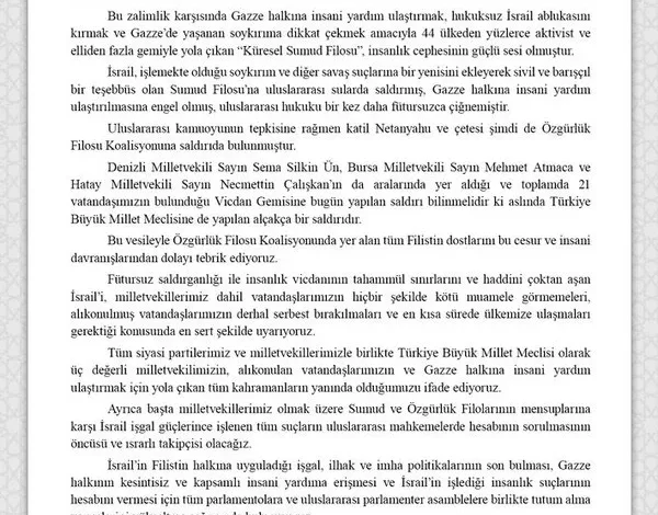 Fütursuz saldırganlığı ile insanlık vicdanının tahammül sınırlarını ve haddini çoktan aşan İsrail’i, milletvekillerimiz dahil vatandaşlarımızın hiçbir şekilde kötü muamele görmemeleri, alıkonulmuş vatandaşlarımızın derhal serbest bırakılmaları ve en kısa sürede ülkemize ulaşmaları gerektiği konusunda en sert şekilde uyarıyoruz.