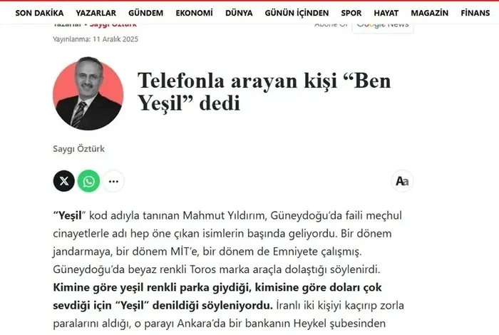 Öztürk yazısında “9 Aralık 2025 tarihinde saat 13.30 civarında gazetemizin santralinden beni arayan kişiyle, uygun olmadığım için konuşamamıştım. Yarım saat sonra yeniden aradı. ‘Ben Yeşil’ dedi. Tabii ki bu kod isimle bilinen ‘Yeşil’ Bingöl’ün Solhan ilçesi nüfusuna kayıtlı, Güneydoğu’da her olayın içinde olduğu yazılan, söylenen Mahmut Yıldırım’dı.Ama gerçekten arayan Mahmut Yıldırım mı, yoksa onun adını kullanan başkası mıydı bilemem. Ben, onun gerçekten ‘Yeşil’ olduğunu anlamak için geçmişte yazdığım bazı haberlerle ilgili sorular yönelttim” diye yazdı.