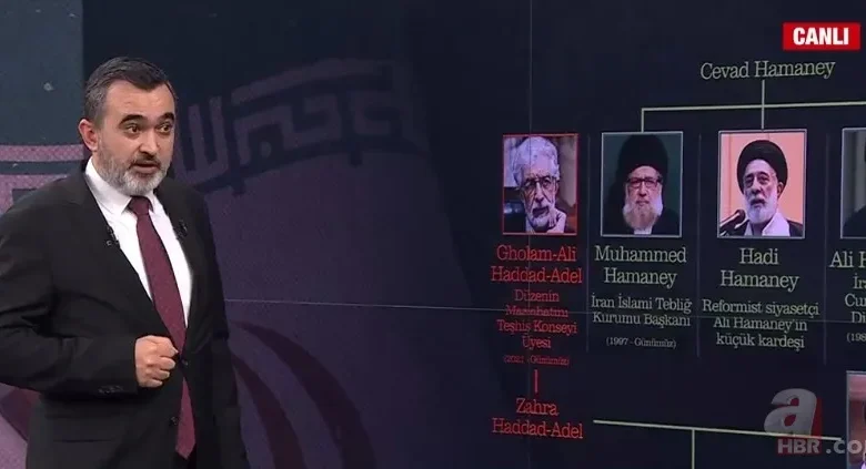 Peki bu Hamaneylerin hangi ailelerle bağlantısı, ilişkisi var? Hemen işte ön plana çıkan Mücteba Hamaney’in aslında kayınbabası Gulam Ali Haddad Adel. Çok önemli bir isim İran içerisinde. 2020’den bugüne kadar da Düzenin Maslahatını Teşhis Konseyi Üyesi. Yani çok üst düzey İran’da bir siyasi isim. Aynı zamanda aşırı muhafazakarlığıyla da ön plana çıkan bir isimden bahsediyoruz. Gulam Ali Haddad Adel’in kızıyla evli Mücteba Hamaney. Zehra Haddad Adel’le evli ve bu evlilikten de 3 çocukları var; Muhammed, Fatma ve Muhammed Emin olmak üzere. İşte Hamaneylerin buradaki Haddad Adel ile bu şekilde bir akrabalık ilişkisi o ailenin biraz daha oradaki etkisini daha da güçlendiriyor.