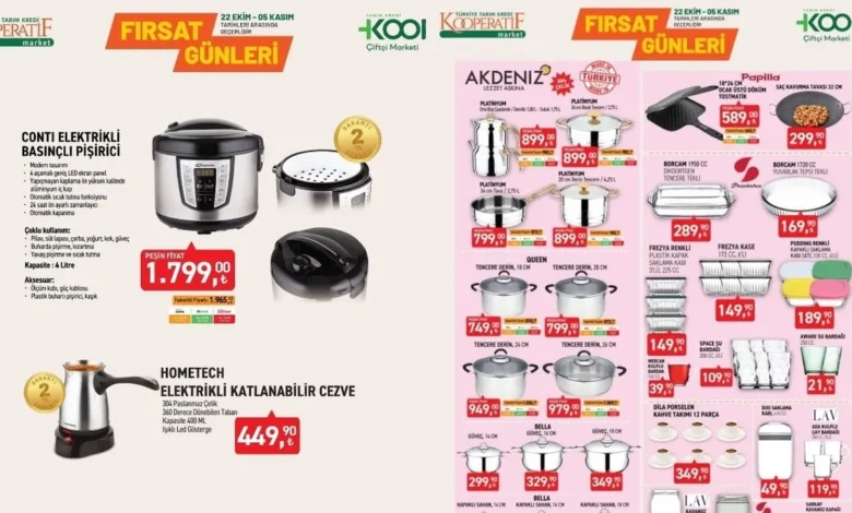 Tarım Kredi Market’in fırsat günleri başladı. 5 Kasım’a kadar devam edecek kampanyada paslanmaz çelik tencereler, döküm tostmatik ve borcam ürünlerinde dikkat çeken indirimler müşterileri bekliyor. Kooperatif marketlerinde hem kalite hem uygun fiyat arayan tüketiciler için mutfak alışverişinde avantajlı dönem başladı.