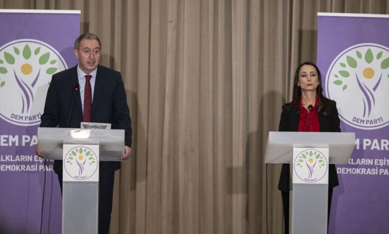 DEM Parti Eş Genel Başkanları Tuncer Bakırhan ve Tülay Hatimoğulları, bir otelde, terör örgütü PKK’nın Türkiye‘den çekilme kararına ve sürece ilişkin basın toplantısı düzenledi.