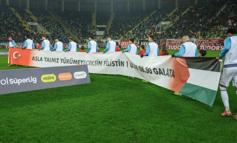 Trabzonsporlu futbolcular seremoniye, “Asla yalnız yürümeyeceksin Filistin 1 Ocak 08.30 Galata” yazılı pankartla çıktı.