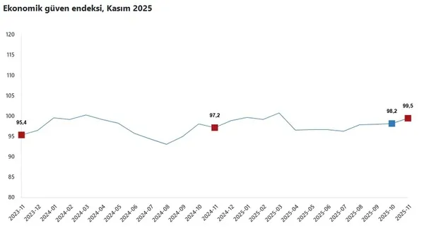 Ekonomik güven endeksi Ekim ayında 98,2 iken, Kasım ayında %1,3 oranında artarak 99,5 değerini aldı.