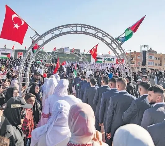 Gazze Şeridi’nin orta kesimindeki Deyr Belah’ta yer alan Zavayide bölgesinde, Ribat Eğitim Vakfı tarafından düzenlenen toplu nikâh töreninde 203 çift dünyaevine girdi. İsrail’in 2 yıl boyunca binlerce insanı hayattan kopardığı ve taş üstünde de taş bırakmadığı Gazze’de toplumun temel taşı olan ailelerin ilk tohumları atıldı.