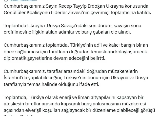 “Cumhurbaşkanımız Sayın Recep Tayyip Erdoğan Ukrayna konusunda Gönüllüler Koalisyonu Liderler Zirvesi’nin çevrimiçi toplantısına katıldı.
