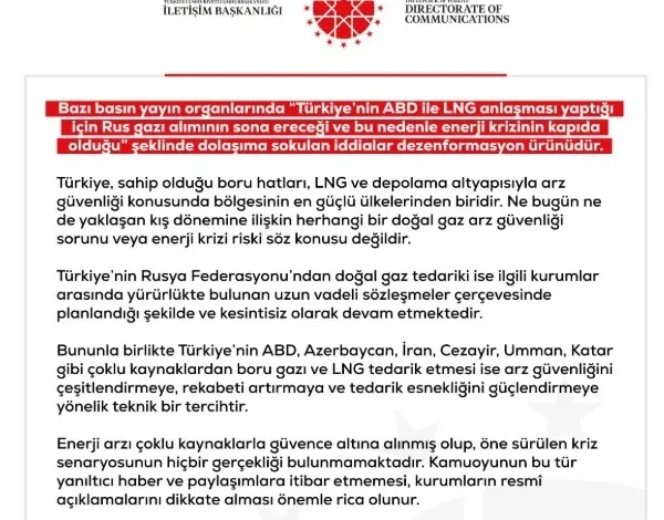 “Bununla birlikte Türkiye’nin ABD, Azerbaycan, İran, Cezayir, Umman, Katar gibi çoklu kaynaklardan boru gazı ve LNG tedarik etmesi ise arz güvenliğini çeşitlendirmeye, rekabeti artırmaya ve tedarik esnekliğini güçlendirmeye yönelik teknik bir tercihtir. Enerji arzı çoklu kaynaklarla güvence altına alınmış olup, öne sürülen kriz senaryosunun hiçbir gerçekliği bulunmamaktadır. Kamuoyunun bu tür yanıltıcı haber ve paylaşımlara itibar etmemesi, kurumların resmi açıklamalarını dikkate alması önemle rica olunur.”