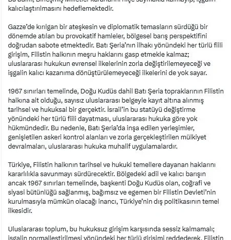 “Bu adım, Birleşmiş Milletler kararlarını hiçe saymakla kalmayıp, işgalin kalıcılaştırılmasını hedeflemektedir. Gazze’de kırılgan bir ateşkesin ve diplomatik temasların sürdüğü bir dönemde atılan bu provokatif hamleler, bölgesel barış perspektifini doğrudan sabote etmektedir. Batı Şeria’nın ilhakı yönündeki her türlü fiili girişim, Filistin halkının meşru haklarını gasp etmekle kalmaz; uluslararası hukukun evrensel ilkelerinin zorla değiştirilemeyeceği ve işgalin kalıcı kazanıma dönüştürülemeyeceği ilkelerini de yok sayar.