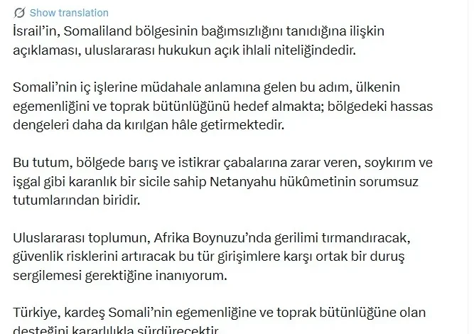 “Somali’nin iç işlerine müdahale anlamına gelen bu adım, ülkenin egemenliğini ve toprak bütünlüğünü hedef almakta; bölgedeki hassas dengeleri daha da kırılgan hâle getirmektedir.