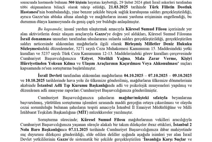 Bu kapsamda, insanî yardım ulaştırmak amacıyla Küresel Sumud Filosu içerisinde yer alan aktivistlerin deniz ulaşım araçlarıyla Gazze’ye doğru yol aldıkları, Küresel Sumud Filosuna İsrail donanması unsurları tarafından uluslararası sularda saldırı gerçekleştirildiği, gerçekleştirilen saldırı neticesinde alıkonulan mağdurlarla ilgili olarak Birleşmiş Milletler Deniz Hukuku Sözleşmesindeki düzenlemeler, 5271 sayılı Ceza Muhakemesi Kanununun 15. Maddesindeki yetki kuralları ve 5237 sayılı Türk Ceza Kanununun 12-13. Maddelerindeki görev kuralları çerçevesinde Cumhuriyet Başsavcılığımızca ‘Eziyet, Nitelikli Yağma, Mala Zarar Verme, Kişiyi Hürriyetinden Yoksun Kılma ve Ulaşım Araçlarının Kaçırılması Veya Alıkonulması suçları kapsamında re’sen soruşturma başlatılmıştır.