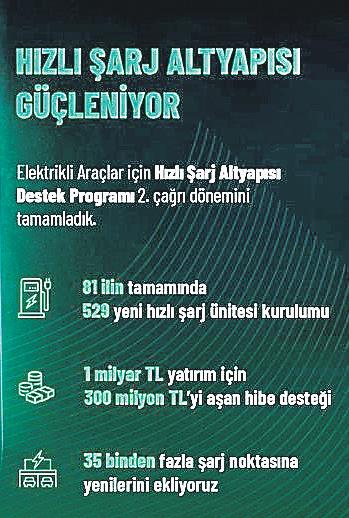 Bakan Kacır, şu ifadeleri kullandı: “Elektrikli Araçlar için Hızlı Şarj Altyapısı Destek Programı’mızın ikinci çağrısını tamamladık. 81 ilin tamamında 529 ünite kurulumuna daha destek veriyoruz. 1 milyar liralık yatırım için 300 milyon lirayı aşan hibe desteği sunuyoruz. 35 bini aşkın şarj noktasına yenilerini ekleyerek altyapıyı ülkemizin her noktasına taşıyoruz.”