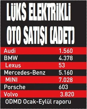Premium segmentte elektrikli rekabetine giren markalar arasında Audi, BMW, Mercedes-Benz, MINI, Maserati, Lexus, Porsche ve Volvo bulunuyor. ODMD verilerine göre, yılın ilk dokuz ayında en çok elektrikli model satışı gerçekleştiren premium marka MINI oldu. Tek bir modelle 7 bin 28 adetle lider oldu. Onu, 5 bin 160 adetle, Mercedes- Benz ve 4 bin 378 adetle BMW izledi.