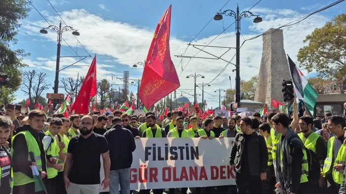Ellerinde Filistin bayraklarıyla İsrail aleyhine sloganlar atan kalabalık, “Bir adım ötede insanlık ölüyor, kahrolsun İsrail”, “Müslümanlar birleşin” yazılı pankartlar taşıyor.