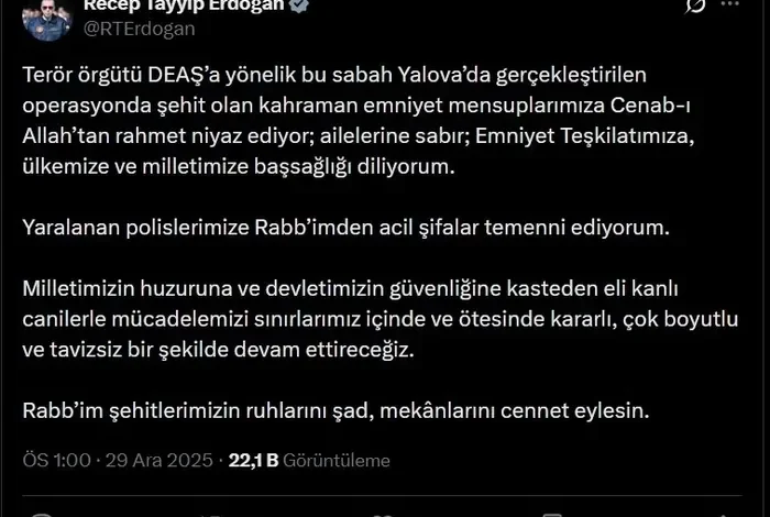 Erdoğan, sosyal medya hesabından yaptığı açıklamada, “Terör örgütü DEAŞ’a yönelik bu sabah Yalova’da gerçekleştirilen operasyonda şehit olan kahraman emniyet mensuplarımıza Cenabıallah’tan rahmet niyaz ediyor, ailelerine sabır, Emniyet Teşkilatımıza, ülkemize ve milletimize başsağlığı diliyorum. Yaralanan polislerimize Rabb’imden acil şifalar temenni ediyorum.” ifadelerini kullandı.