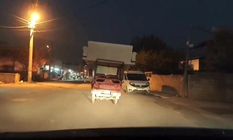 Payas ilçesinde aracıyla seyir halinde olan sürücü, 3 tekerli motosiklet üzerinde koltuk taşındığını görünce o anları kayda aldı.