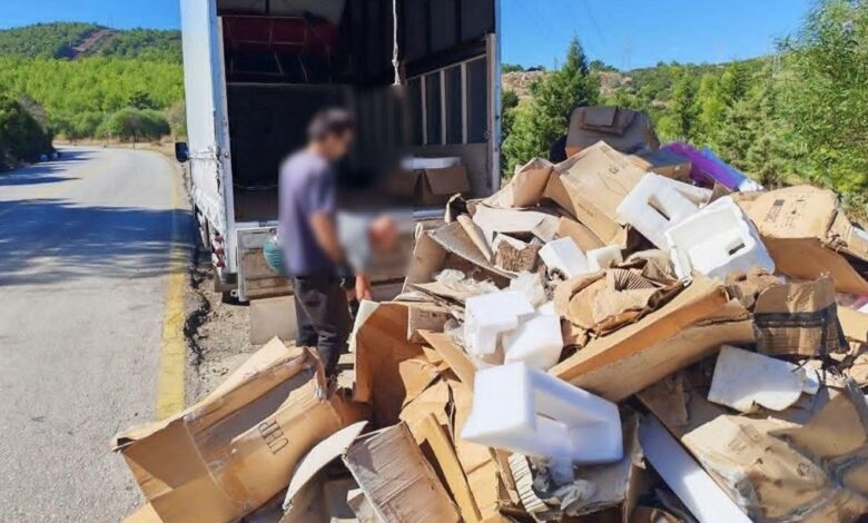 Muğla’nın Bodrum ilçesinde Torba Mahallesi Eski Bodrum Yolu üzerinde çöp konteyneri yanına karton, köpük, kablo ve çeşitli plastiklerden oluşan yaklaşık bir kamyon dolusu atık döküldü.