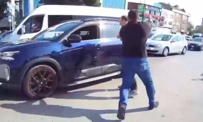 Tartışmanın büyümesi üzerine aracından inen sürücü diğer sürücünün yanına gitti, küfür ederek saldırmaya başladı.
