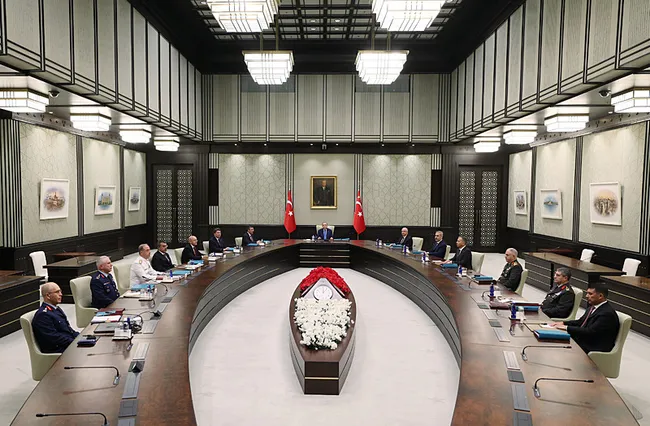 Başkan Recep Tayyip Erdoğan başkanlığındaki Yüksek Askeri Şura (YAŞ) toplantısı başladı. Cumhurbaşkanlığı Külliyesi’ndeki toplantıya Şura üyeleri Cumhurbaşkanı Yardımcısı Cevdet Yılmaz, Adalet Bakanı Yılmaz Tunç, Dışişleri Bakanı Hakan Fidan, Hazine ve Maliye Bakanı Mehmet Şimşek, İçişleri Bakanı Ali Yerlikaya, Milli Eğitim Bakanı Yusuf Tekin, Milli Savunma Bakanı Yaşar Güler, Genelkurmay Başkanı Orgeneral Metin Gürak, Kara Kuvvetleri Komutanı Orgeneral Selçuk Bayraktaroğlu, Deniz Kuvvetleri Komutanı Oramiral Ercüment Tatlıoğlu ve Hava Kuvvetleri Komutanı Orgeneral Ziya Cemal Kadıoğlu katıldı.