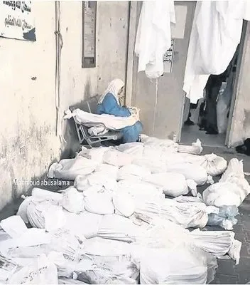 İsrail’in Gazze katliamının sembolü ise bana göre bu fotoğraf olacak. Kendisi de evlatlarını toprağa vermiş bir annenin zorunlu olarak edindiği yeni işi: Cenaze kefenlemek. Talebe yetişebilirse tabii…