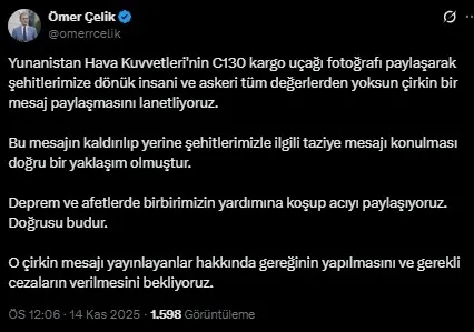 Ömer Çelik, NSosyal hesabından yaptığı paylaşımda şunları kaydetti: “Yunanistan Hava Kuvvetlerinin C130 kargo uçağı fotoğrafı paylaşarak şehitlerimize dönük insani ve askeri tüm değerlerden yoksun çirkin bir mesaj paylaşmasını lanetliyoruz. Bu mesajın kaldırılıp yerine şehitlerimizle ilgili taziye mesajı konulması doğru bir yaklaşım olmuştur. Deprem ve afetlerde birbirimizin yardımına koşup acıyı paylaşıyoruz. Doğrusu budur. O çirkin mesajı yayımlayanlar hakkında gereğinin yapılmasını ve gerekli cezaların verilmesini bekliyoruz.”