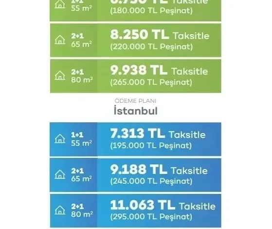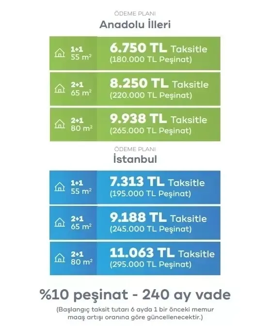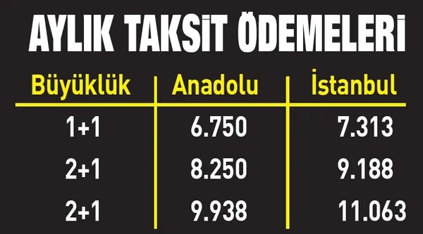 Konutların fiyatı ve taksit tutarları İstanbul ve Anadolu illerinde farklı olacak. Anadolu’da 1+1 konutlar 1 milyon 800 bin TL, 65 metrekarelik 2+1’ler 2 milyon 200 bin TL, 80 metrekarelik 2+1’ler ise 2 milyon 650 bin TL’den satışa sunulacak. Anadolu’da 1+1 konutların taksitleri 6 bin 750 TL olacak. 65 metrekarelik 2+1’lerin taksitleri 8 bin 250 TL, 80 metrekarelik 2+1’lerin taksitleri ise 9 bin 938 TL olarak belirlendi.