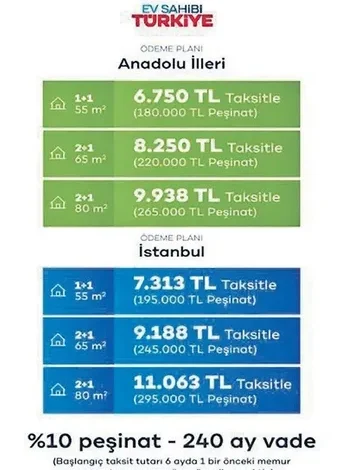 Konutların fiyatı ve taksit tutarları İstanbul ve Anadolu illerinde farklı olacak. Anadolu’da 1+1 konutlar 1 milyon 800 bin lira, 65 metrekarelik 2+1’ler 2 milyon 200 bin lira, 80 metrekarelik 2+1’ler ise 2 milyon 650 bin liradan satışa sunulacak. Anadolu’da 1+1 konutların taksitleri 6 bin 750 lira olacak. 65 metrekarelik 2+1’lerin taksitleri 8 bin 250 lira, 80 metrekarelik 2+1’lerin taksitleri ise 9 bin 938 lira olarak belirlendi. İstanbul’da ise 1+1 konutlar 1 milyon 950 bin lira, 65 metrekarelik 2+1’ler 2 milyon 450 bin lira, 80 metrekarelik 2+1’ler de 2 milyon 950 bin liradan satışa sunulacak. İstanbul’da 1+1 konutların taksitleri 7 bin 313 lira, 65 metrekarelik 2+1’lerin taksitleri 9 bin 188 lira, 80 metrekarelik 2+1’lerin taksitleri ise 11 bin 63 lira olarak belirlendi.
