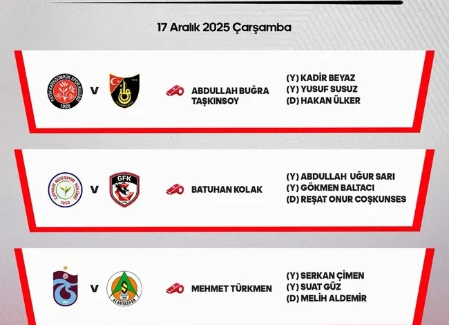 Atv ve A Spor ekranları yayınlanan Ziraat Türkiye Kupası’nda 17 Aralık Çarşamba ve 18 Aralık Perşembe günü oynanacak maçların hakemleri belli oldu.